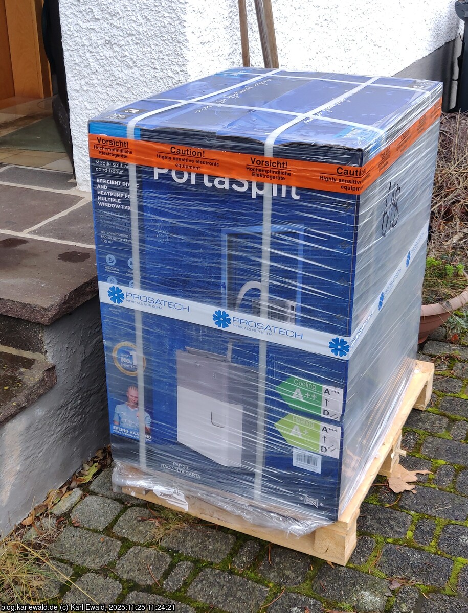 Aber das Produkt Midea PortaSplit hat mein Interesse geweckt: eine Split-Klimaanlage, die als Gesamtsystem betriebsbereit daherkommt und von mir selbst aufgestellt werden kann. Nachteil ist, dass sie R32 und nicht das klimafreundliche R290 (Propan) verwendet. Im Vergleich zu einem 2kW Heizlüfter macht sie fast die doppelte Wärme bei halbem Stromverbrauch. Auf den Preisvergleichsportalen erscheint Prosatech ziemlich weit oben, und bietet sie auch aktuell noch für 749 € inkl. Versand an. Ich habe sie zu diesem Preis am 19.11. bestellt und am 25.11. hat sie mir der Spediteur vor die Tür gestellt.