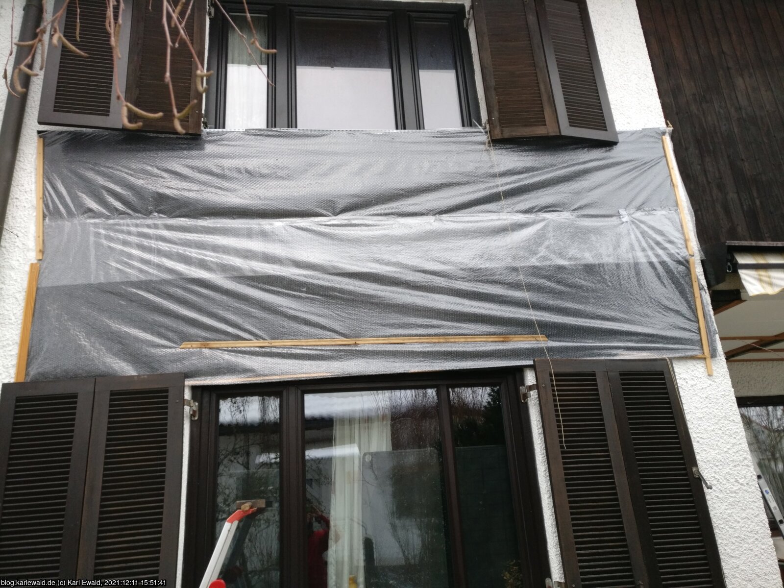 Die Oberkante des Stoffs ist an gestückelte Holzlatten getackert, die ich mit Kabelbindern an den Scharnierträgern der Fensterläden befestigt habe. So war das aber zu lose und der Wind hat damit gespielt. Ich habe im Nachgang daher noch seitlich dünne Latten drangetackert und diese mit Schnüren an den Haltern der Regenrinne links bzw. in die Terrassennische rechts verzurrt, und senkrechte Latten etwa an den Fensterkanten hinter die Fensterläden gespreizt. Trotzdem hat der Wind reichlich dran gerüttelt und ist auch dahintergefahren. Diesen Winter wollte ich daher vieles besser machen.