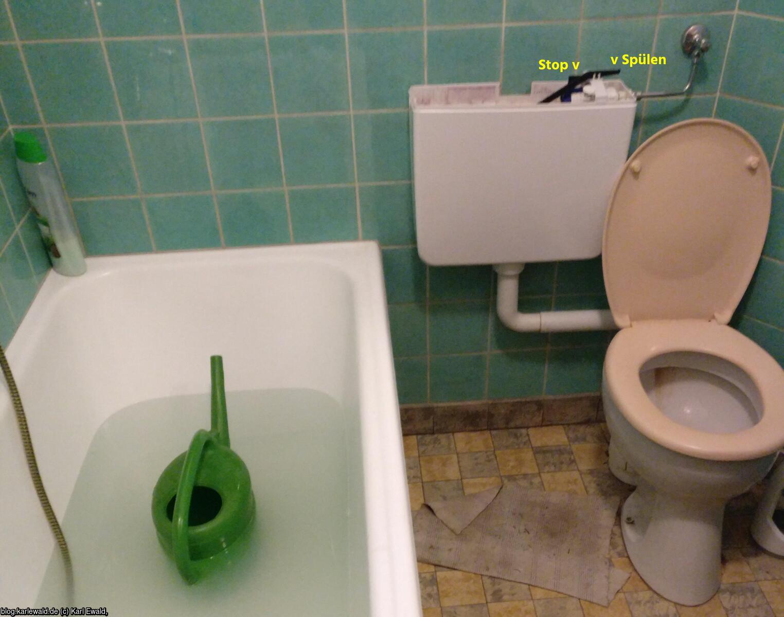 Was mach ich nun mit dem Wasser? Die Frage stellt sich vermutlich den meisten nicht, natürlich Stöpsel ziehen und ablaufen lassen. Nö, ich lasse es einfach in der Wanne stehen. Direkt neben der Badewanne ist die Toilette, ich glaube das ist ein gar nicht so untypisches Layout für ein Bad/WC. Vom Spülkasten habe ich den Deckel entfernt (dann hat man keine so schicke Großflächentaste, aber der Hebel zum Spülen ist auch so leicht zu finden). Und mit einer Gießkanne schütte ich das Badewasser dann nach der Toilettenbenutzung in den Spülkasten: